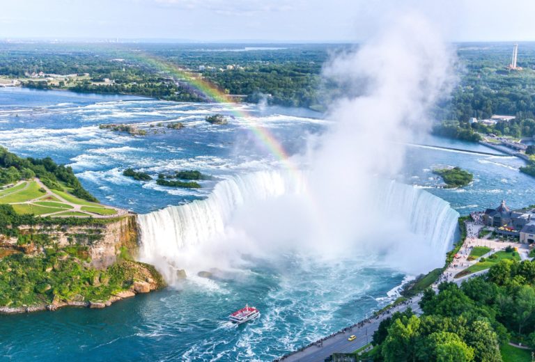 Niagara Falls is a combination of 3 waterfalls at the Southern end of Niagara Gorge. The largest of the 3 falls is the Horseshoe falls which straddles the international border between USA and Canada. It is actually in the Niagara River which drains Lake Erie into Lake Ontario. It has the highest water flow in the USA and displaces 6 million cubic feet of water per minute over the falls.
