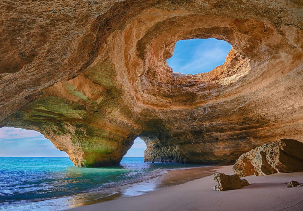 This beautiful cave is situated on the fishing village of Praia de Benagil Beach. It is along the southern coast of Portugal, closer to the Strait of Gibraltar. This cave has a round hole in the ceiling that frames the beautiful blue sky inside. Inside the cave is a small, magical beach. From inside the cave, you will see the blue sky through an opening in the ceiling, also known as the eye. One can reach the cave by boat or kayak.