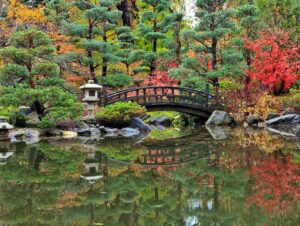 The Anderson Japanese Gardens is a 12-acre Japanese garden located in Rockford, Illinois. The gardens are in a 13th-century “pond strolling” garden with several waterfalls and ponds, streams, rock formations, winding paths, and a tea house.  The “Garden of Reflection” is a contemporary Japanese-inspired garden, with bronze angel sculptures by famous architects. Plantings include Japanese maples, pines, magnolia, lavender…etc.