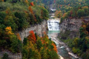 Letchworth State Park is a 14,427-acre New York State Park located in Livingston County and Wyoming County in the northwestern part of the State of New York. The park is roughly 17 miles long, following the course of the Genesee River as it flows north through a deep gorge and over several large waterfalls.