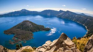 Crater Lake is a crater lake in south-central Oregon in the western United States. It is the main feature of Crater Lake National Park and is famous for its deep blue color and water clarity. With a depth of 1,949 feet (594 m), the lake is the deepest in the United States. In the world, it ranks ninth for maximum depth, and third for mean (average) depth.