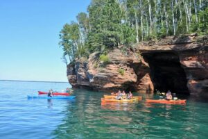 Apostle Islands National Lakeshore comprises a stretch of shoreline and 21 islands at the northern tip of Wisconsin, on Lake Superior. On the mainland, the Lakeshore Trail winds past cliffs and sea caves. Many islands have trails, beaches and marinas. . Sand Island and Raspberry Island have 19th-century lighthouses. The Lucerne shipwreck is just off Long Island.